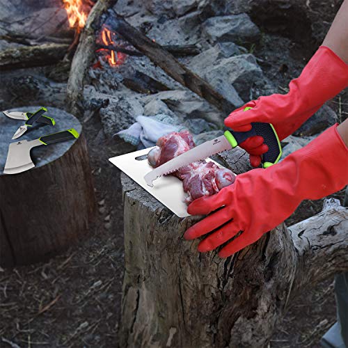 10 Piece Fish & Deer Game Processing Set with Store Case – Sturdy Black Box loaded with 7-1/4″ Caping Knife, 8-3/4″ Gut-hook Knife, 12″ Boning Knife, 9″ Game Shears, 9-1/2″ Wood/Bone Saw, 10-3/4″ Butcher Knife, Cutting Board, Rib Spreader, HCS Knife Sharpener, Red Game Cleaning Gloves