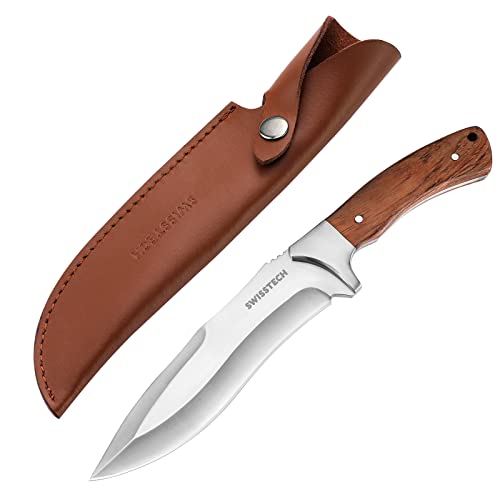 Swiss+Tech Hunting Knife with Leather Sheath, 11-5/8 inch Fixed Blade Full-Tang Construction, Ergonomic Wood Handle Knife for Outdoor Survival, Camping, Hiking, Brushcraft, Gift for Dad Husband Men
